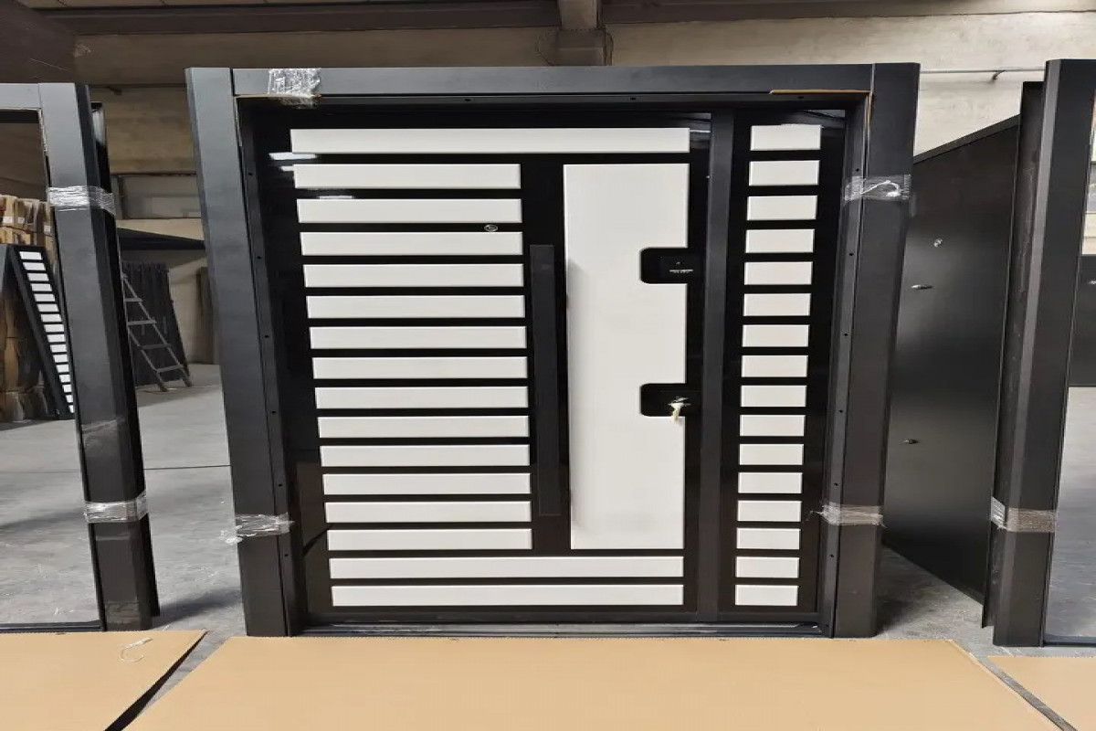 Solid wood-veneer door with pronounced horizontal wood grain patterns and a robust steel core for superior security and classic style.